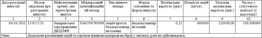 - Iнформацiя про iншi цiннi папери, випущенi емiтентом - так як Товариство здiйснило випуск лише простих iменних акцiй, iншi цiннi папери Товариством не випускались.