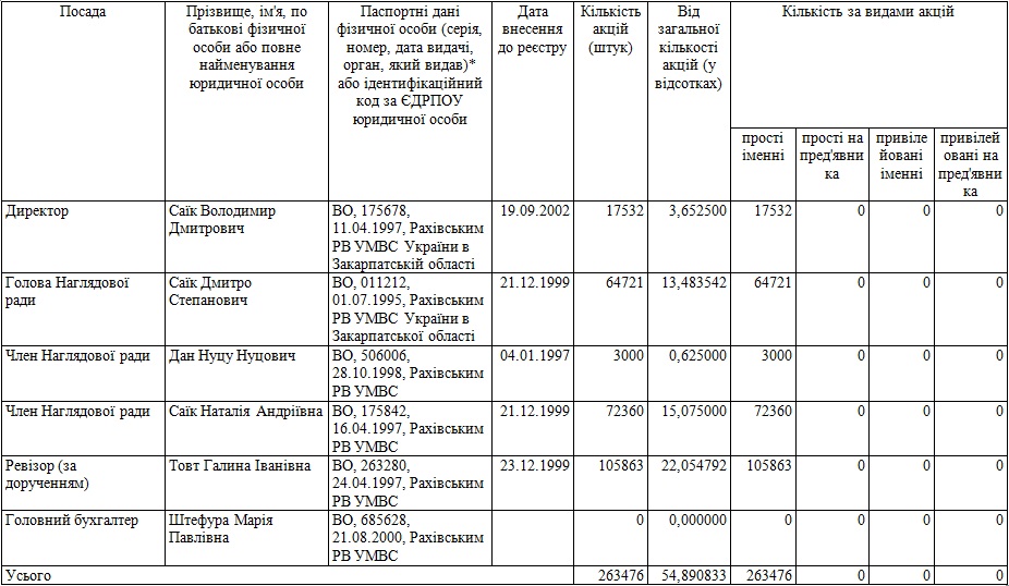 | 6.1.7. Найменування підприємства та попередня посада, яку займав** | Голова правління, Директор ВАТ"Рахівський маслозавод" |
