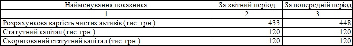 Розрахункова вартість чистих активів перевищує статутний капітал на 313 тис.грн. Розрахункова вартість чистих активів перевищує скоригований статутний капітал на 313 тис.грн. Вимоги частини третьої статті 155 Цивільного кодексу України дотримані. Зменшення статутного капіталу не вимагається.