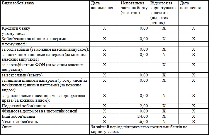- У товариства вiдсутнi зобов"язання: за кредитом, за випуском облiгацiй, за фiнансовими iнвестицiями в корпоративнi права.