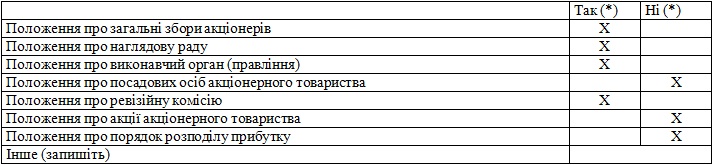 | Чи містить статут акціонерного товариства положення, яке обмежує повноваження виконавчого органу приймати рішення про укладення договорів, враховуючи їх суму, від імені акціонерного товариства? (так/ні) | ні |
