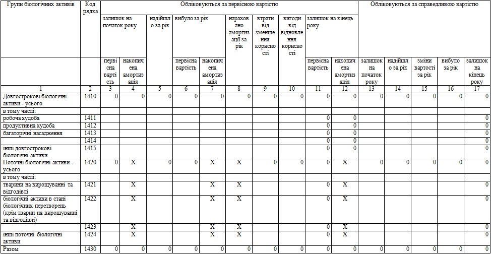| З рядка 1430 графа 6 і графа 16 | залишкова вартість довгострокових біологічних активів, первісна вартість поточних біологічних активів і справедлива вартість біологічних активів, утрачених унаслідок надзвичайних подій | 1432 |